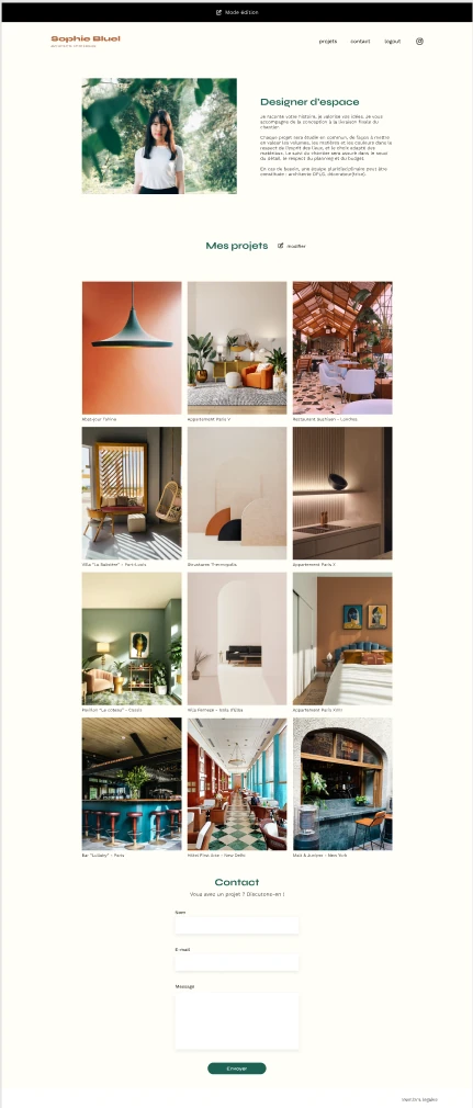 Sophie Bluel, architecte d'intérieur. Un portfolio qui devait évoluer au rythme de ses projets — sans dépendre d'un prestataire à chaque mise à jour.